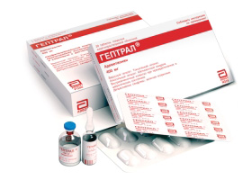- Препараты на основе адеметионина ( Гептрал, Гептор, Гепаретта, Гептразан) действуют, активируя синтез глутатиона в клетках печени. Эти средства обладают регенерирующими и антиоксидантными свойствами, способствуют снижению фиброза и повышают выживаемость даже на последних стадиях заболеваний печени. Адеметионин назначают в дозировке 800 мг в течение месяца (сначала внутривенно, затем в виде таблеток).